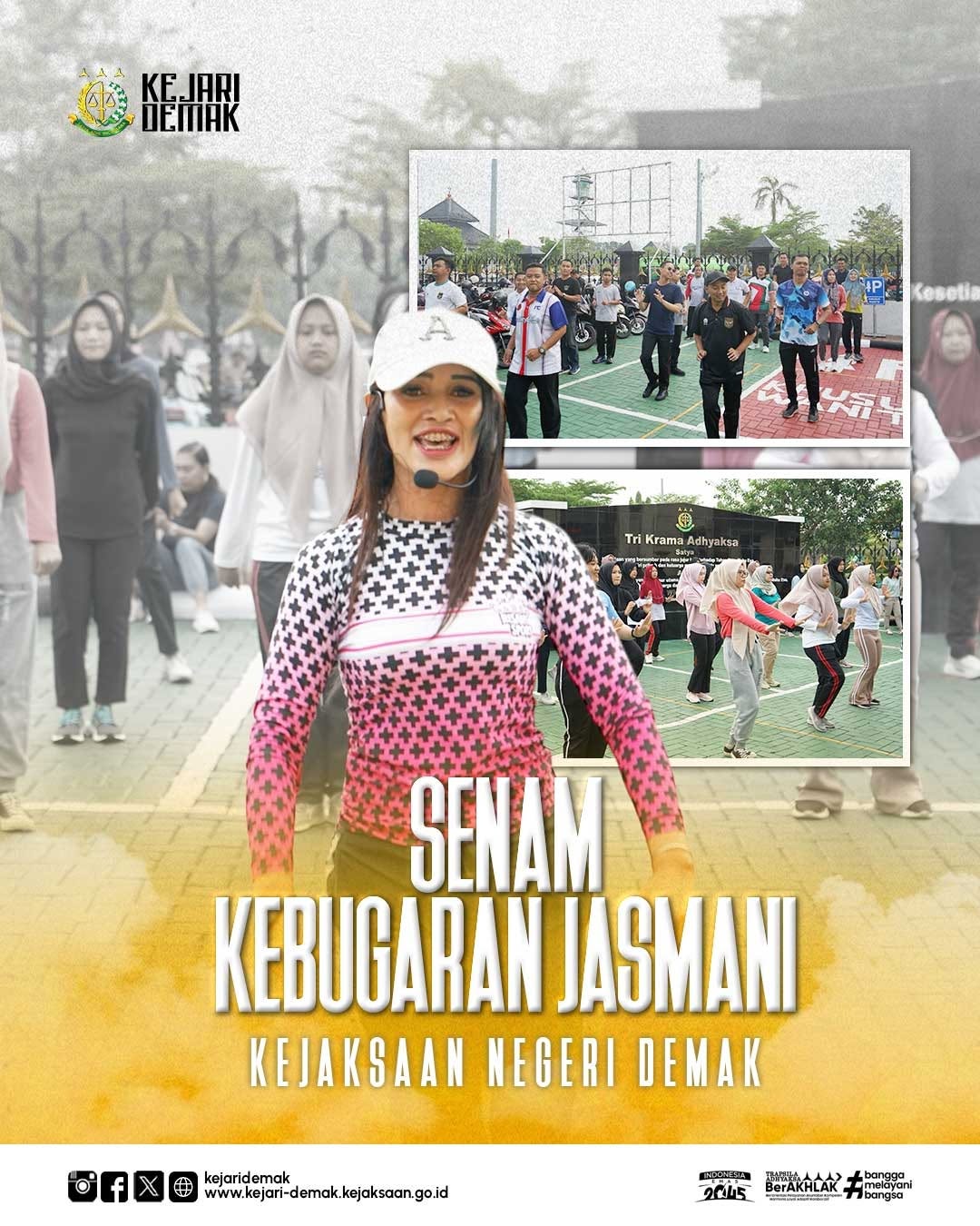 DEMAK, Jum’at (13/06/2025) – Kejaksaan Negeri Demak pada hari Jum’at tanggal 13 Juni 2025 mengadakan kegiatan senam pagi bersama yang diikuti oleh seluruh Pegawai dan PPNPN. Dengan berolahraga mampu untuk meningkatkan kesehatan fisik, memperkuat hubungan antar pegawai, membangun kebersamaan dan meningkatkan produktivitas dalam memberikan pelayanan kepada seluruh Masyarakat. (RA)