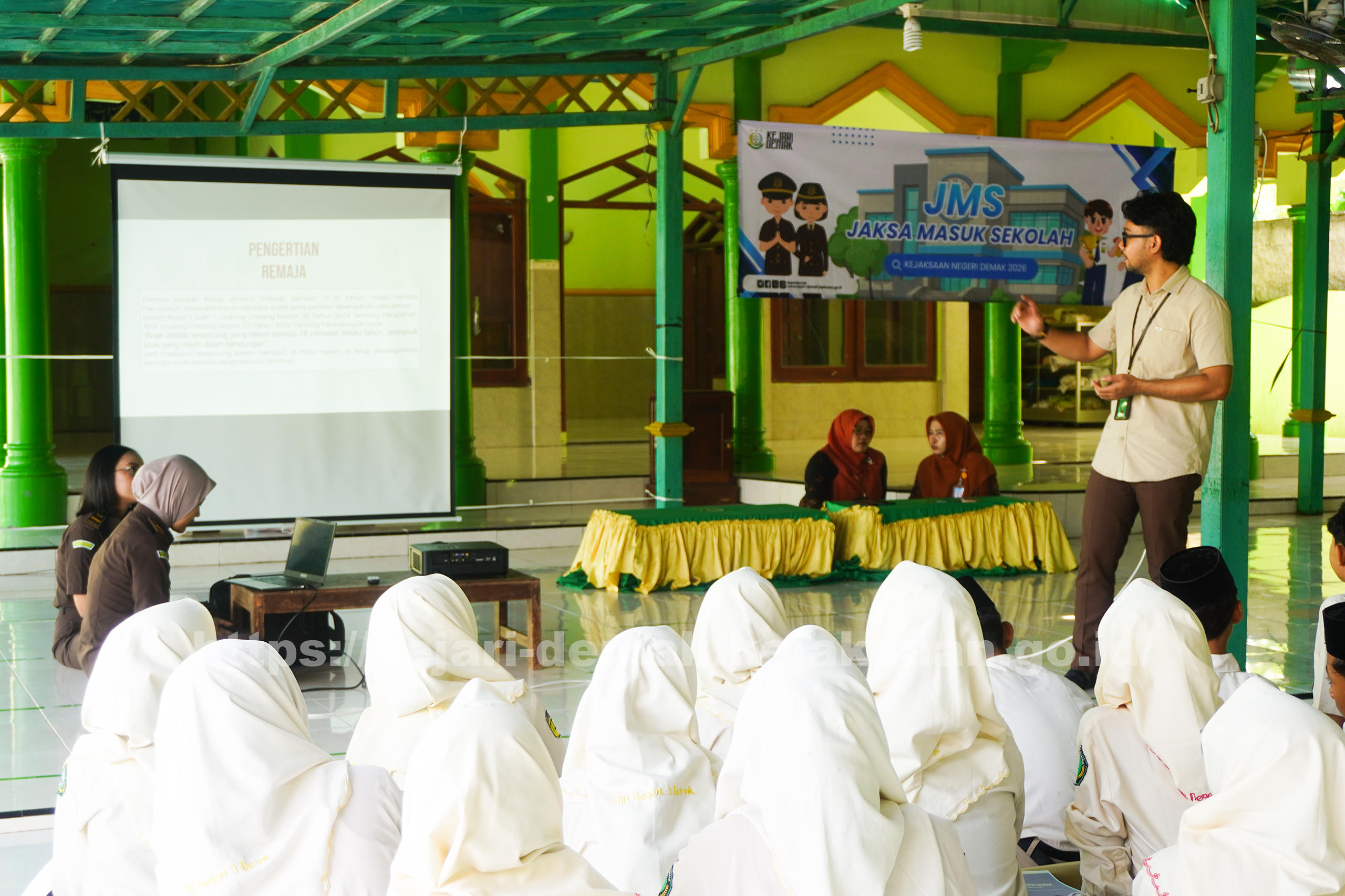 Demak – Kejaksaan Negeri Demak melalui Tim Intelijen melaksanakan kegiatan program Jaksa Masuk Sekolah (JMS) di MTs Negeri 3 Demak pada Kamis, 9 April 2026, sebagai bagian dari upaya pembinaan dan penyuluhan hukum kepada generasi muda. Kegiatan tersebut turut dihadiri oleh Kasubsi Prapenuntutan Bidang Pidum, Dr. Faisal Arif, S.H., M.H., yang memberikan materi secara langsung kepada para siswa dengan pendekatan yang komunikatif dan mudah dipahami.