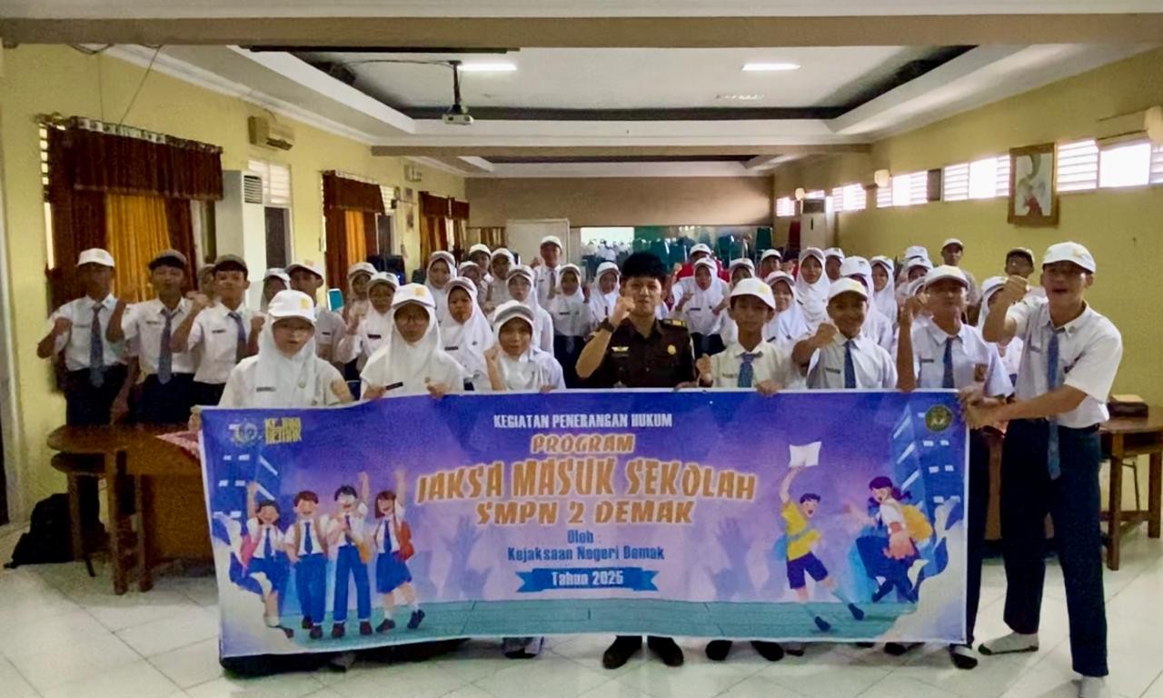 DEMAK – Kejaksaan Negeri Demak terus menunjukkan komitmennya dalam meningkatkan kesadaran hukum di kalangan generasi muda. Melalui program unggulan “Jaksa Masuk Sekolah” (JMS), Bidang Intelijen Kejari Demak menyambangi SMP Negeri 2 Demak pada Senin (28/04/2025). Kegiatan yang berlangsung di aula sekolah ini diikuti dengan antusias oleh 50 siswa-siswi perwakilan dari kelas 7 hingga kelas 9.