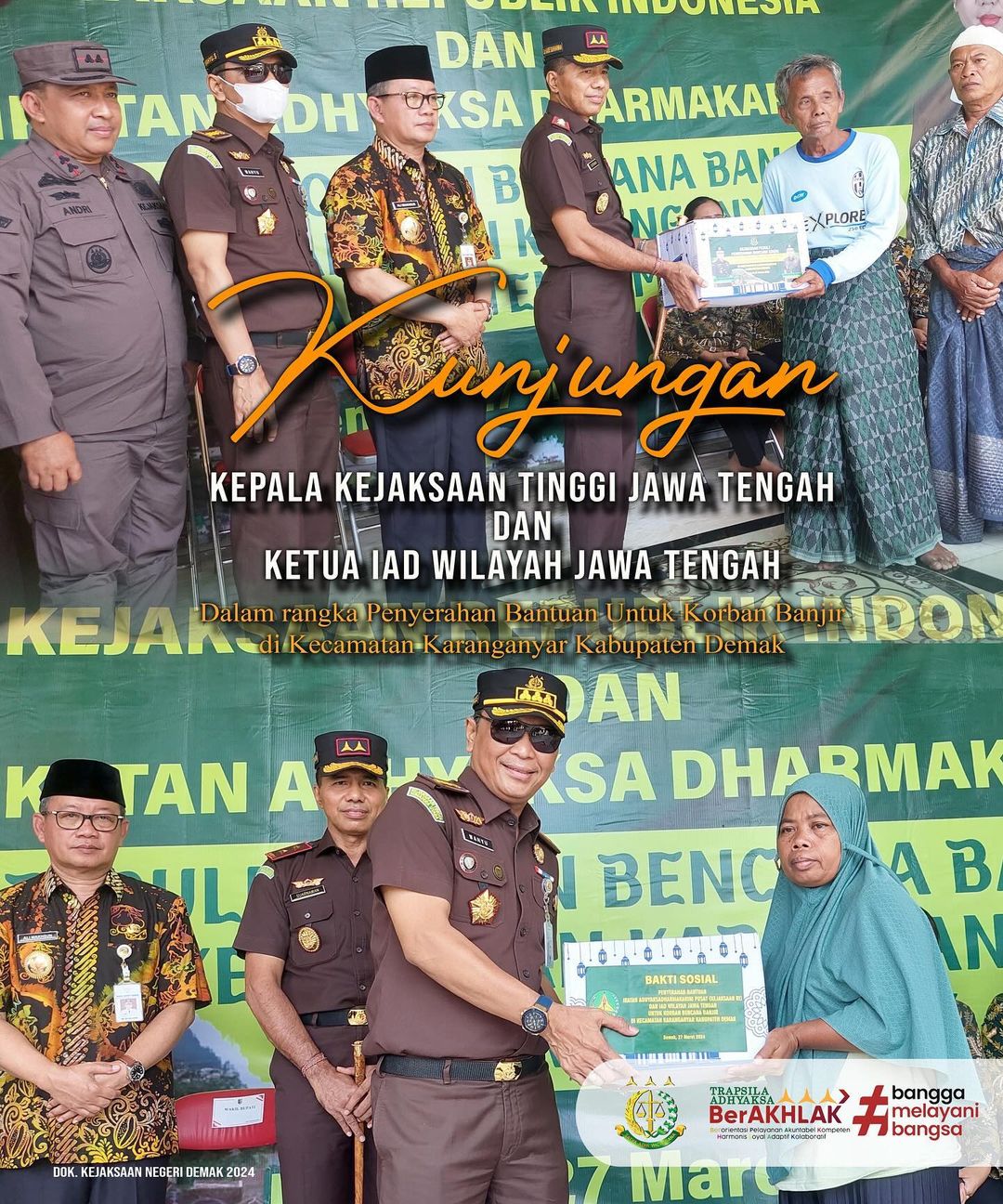 Rabu, (27/3) – Kunjungan Kepala Kejaksaan Tinggi Jawa Tengah dan Ketua IAD Wilayah Jawa Tengah dalam rangka penyerahan bantuan untuk korban banjir di Kec. Karanganyar, Kab. Demak.