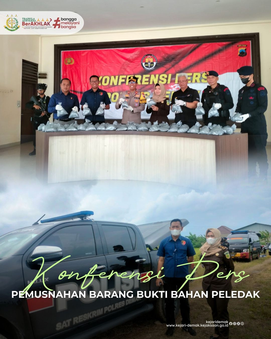 Kamis, (21/3) – Kepala Seksi Barang Bukti dan Barang Rampasan, Dwi Aprilia Wisudowati S, S.H., M.H. menghadiri kegiatan Konferensi Pers dan Pemusnahan Barang Bukti Bahan Peledak dengan berat total 51kg di Polres Demak.